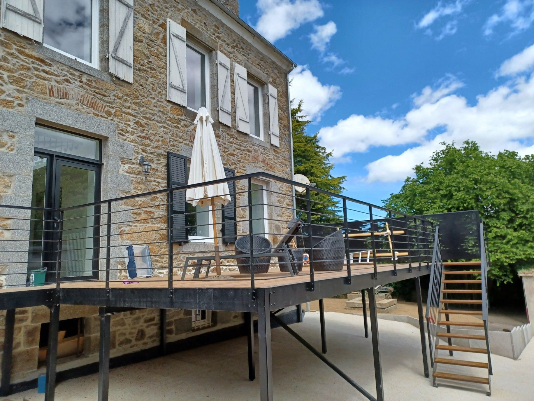 Escalier colimaçon mixte,                                                                               avec palier d arrivée à fleur du plancher de l étage et rampe en rond de diamètre 10.                                                                               Structure dessinée totalement sur mesure adaptée à la configuration de la construction en cours. Courbe et habillage spécifiquement créé dans le design moderne et épuré.                                                                                                                                                              Garde-corps étage vitré en prolongation de l'escalier.                                                                  Bravo à Mathieu pour la réalisation atelier et à Guillaume, Lucas et Fabian pour sa mise en place                                                      L' ouvrage est aussi lourd que beau!!!                                                                                                                              Réalisation sur Hénanbien.